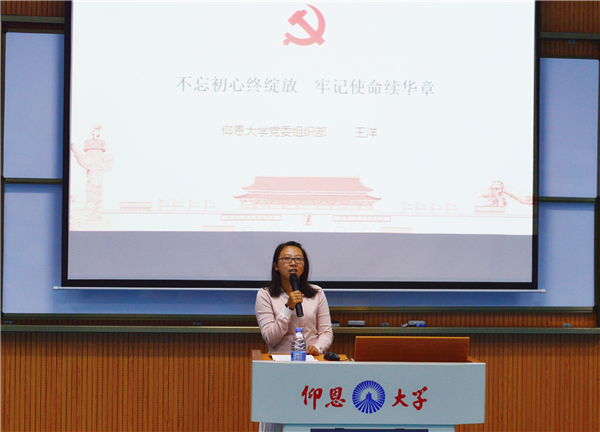 王洋从“历史的新方位”“不忘初心,方得始终”“青年新使命”三个方面诠释了“不忘初心终绽放,牢记使命续华章”的深刻含义,对新时代背景下如何加强高校思政工作进行了理论联系实际的分析。她指出,教师应不忘教育的初心,牢记使命,本着对工作的热爱与责任,以德施教。对于青年,她强调要树立正确的世界观、人生观、价值观。围绕自身学习十九大报告的感悟体会和习近平总书记对青年的谆谆寄语,王洋老师以青年学生感兴趣的方式、接地气的语言,勉励在场学子要不忘初心,努力争做有理想、有本领、有担当的新时代青年,做中华民族伟大复兴的接班人。