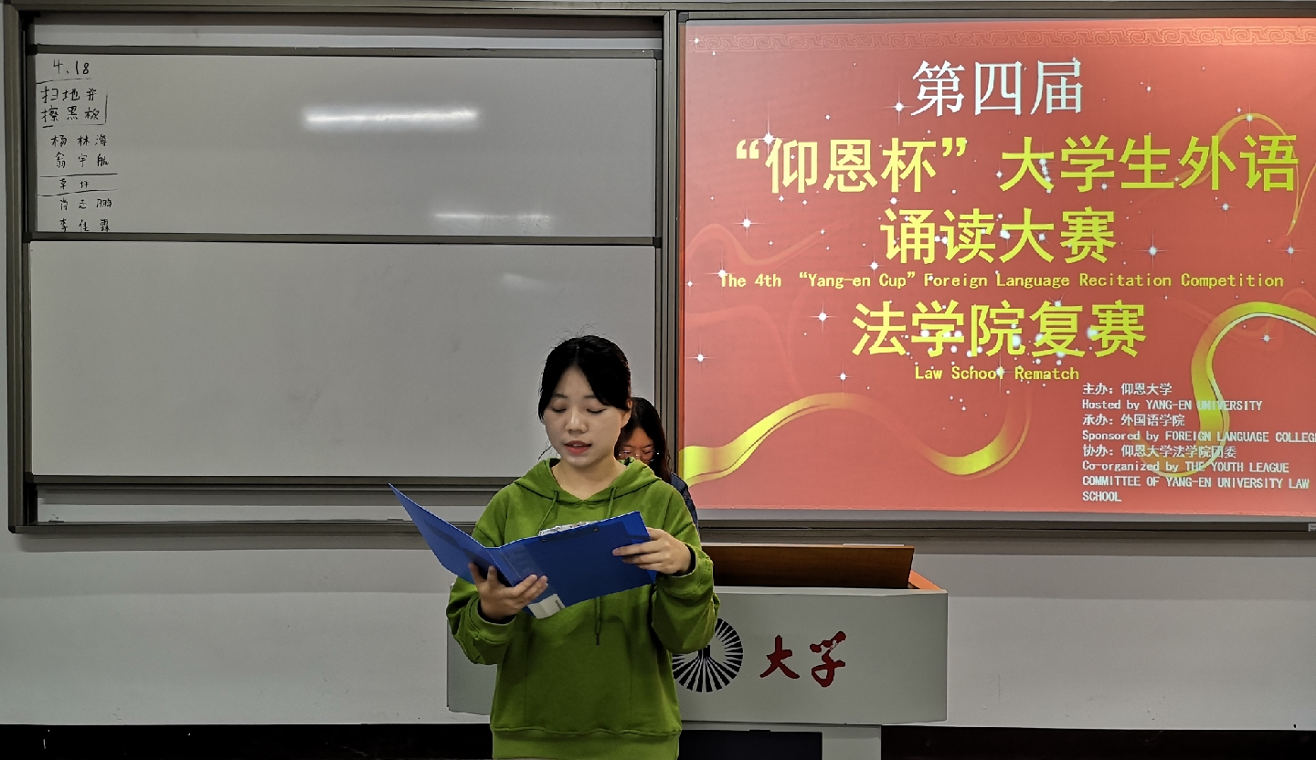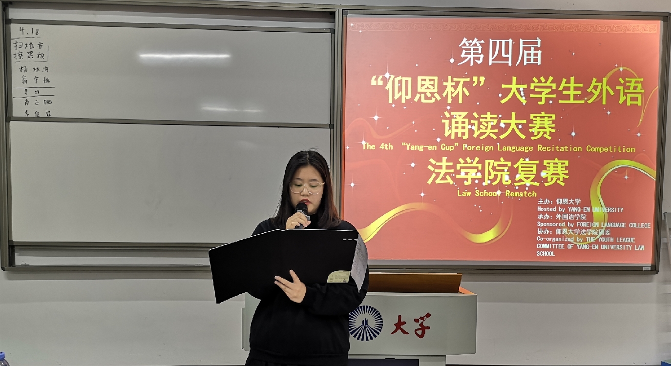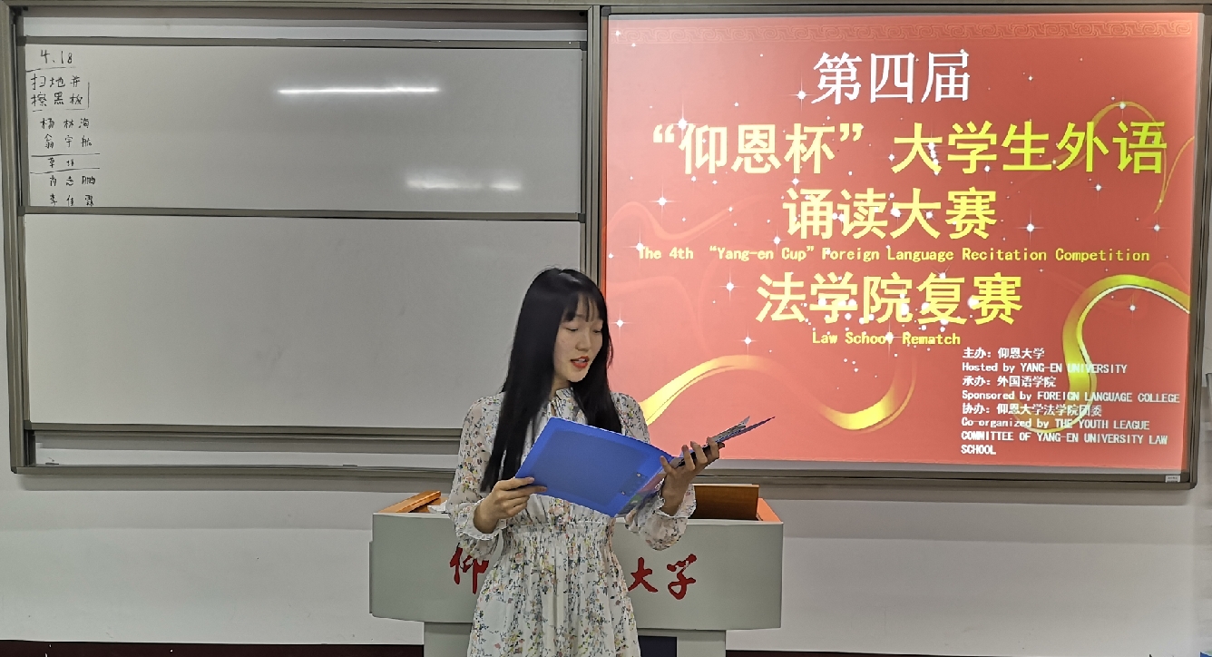 4月18日晚,由仰恩大学主办,外国语学院承办,sunbet申搏官方网站团委协办的第四届“仰恩杯”大学生外语诵读大赛sunbet申搏官方网站复赛于仰恩大学第三教学区普照楼204举行。外国语学院老师陈苗苗,梁正长担任本次比赛评委,sunbet申搏官方网站17级、18级学生参加了此次活动。