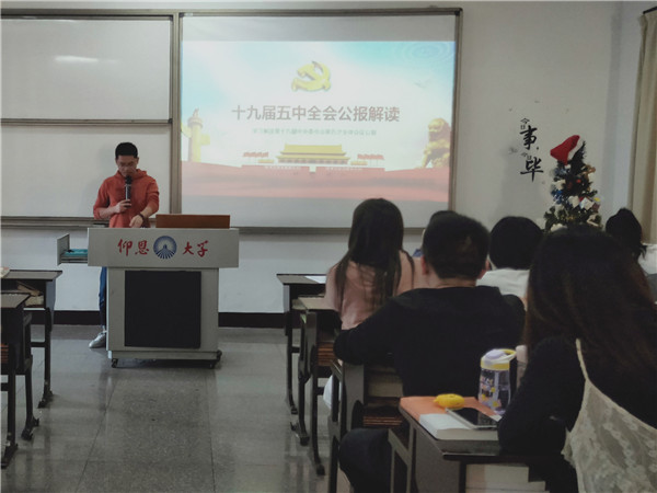 11月16日下午,sunbet申搏官方网站学生党支部于仰恩大学第三校区普照楼302开展《中国共产党第十九届中央委员会第五次全体会议公报》专题学习会,会议由支部书记陈国伟主持,支部全体学生党员参加本次活动。