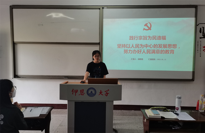 会议伊始,温艳艳同志以“践行宗旨为民造福—坚持以人民为中心的发展思想,努力办好人民满意的教育”为主题,用二十大报告作为导入,切实的讲解了“坚持以人民为中心发展教育”的根本宗旨、出发点和教育服务制度体系;蔡文婷同志从“践行宗旨为民造福”和“办人民满意的教育”两大方面展开阐述,进一步探讨如何办好人民满意的教育;赖远坤同志则以“实干担当促进发展—构造高质量教育体系,加快推进教育强省建设”为主题,通过说明党和国家对教育的重视,强调加快推进教育建设的重要性,以实例介绍了应当如何以人民为中心,努力办好人民满意的教育。