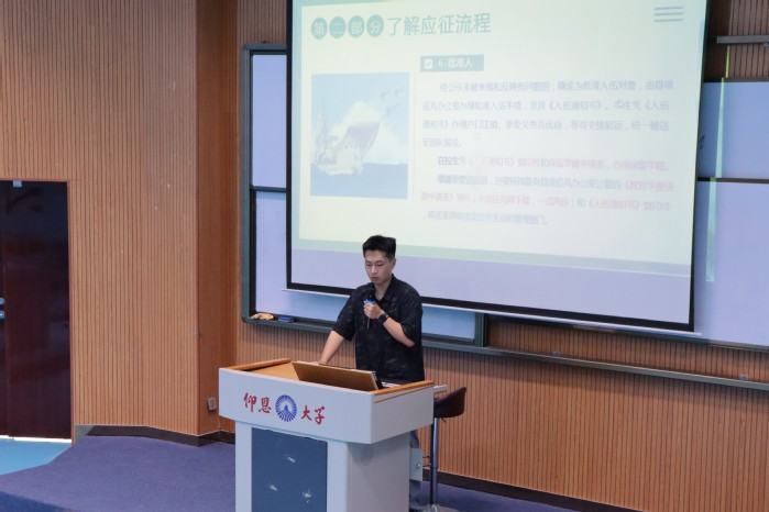强军梦,青春志。会议伊始,退伍兵代表陈文轩结合自身参军经历,从征兵过程、福利待遇等方面展开介绍,详细为同学们解读参军入伍的相关政策法规、报名程序、入伍条件、优待政策和退役安置等方面内容,让同学们充分了解了国家征兵工作的相关条例和优惠政策。最后,陈文轩向同学们发出倡议,呼吁大家积极参与校园征兵,他指出,青春是用来奋斗的,希望同学们能够积极入伍,坚定地走向党和国家需要的地方。