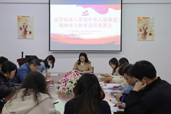 为贯彻落实党的二十届三中全会部署,巩固拓展学习贯彻习近平新时代中国特色社会主义思想主题教育成果,巩固深化党纪学习教育成果,锲而不舍落实中央八项规定精神,推进作风建设常态化长效化,3月28日,sunbet申搏官方网站党总支在第三教学区普照教学楼法律诊所召开深入贯彻中央八项规定精神学习教育动员部署会,学院全体党政班子成员、党总支支委、理论学习中心组成员、各党支部书记、辅导员及全体教师党员参加,会议由学院党总支书记兼副院长杨勤主持。
