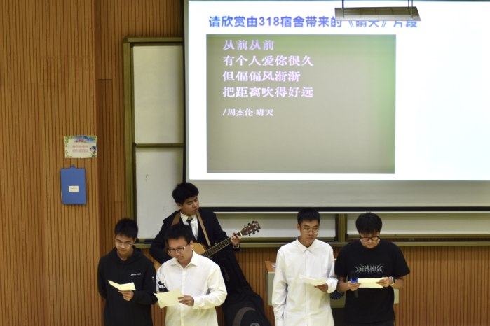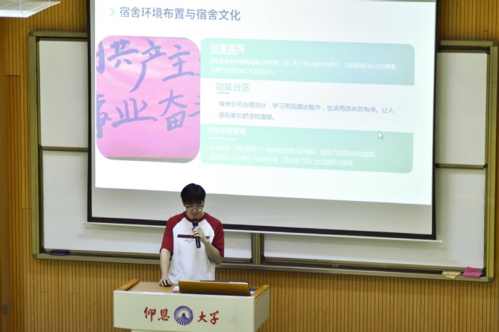 随着主持人宣布活动开始的话音落下,同学们便有序展示自己的宿舍文化。他们以宿舍为单位,通过PPT演示汇报形式,从宿舍人员构成、宿舍布局和宿舍未来展望等出发,充分发挥想象力和团队协作能力,展示宿舍的独特文化,打造出各具特色的“小家”。活动现场掌声不断,各个宿舍风采尽显,有的通过视频展示日常生活,也有歌唱、吉他、舞蹈等才艺展示,赢得了全场观众的阵阵喝彩。