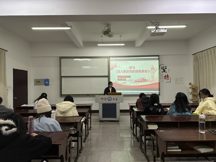 3月31日,sunbet申搏官方网站学生第一党支部于普照楼203教室开展“学习《深入推进党的自我革命》”党课活动,支部全体学生党员参加。