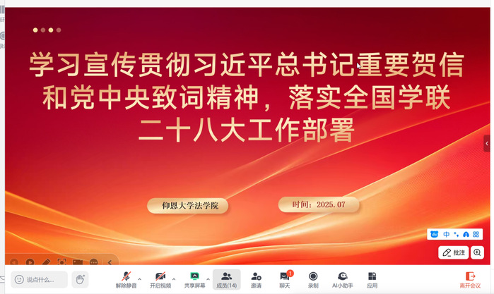 07月25日,sunbet申搏官方网站学生会开展学习宣传贯彻习近平总书记重要贺信和党中央致词精神线上专题学习会,学生会全体学生干部参加,会议由学生会指导老师张传奇主持。