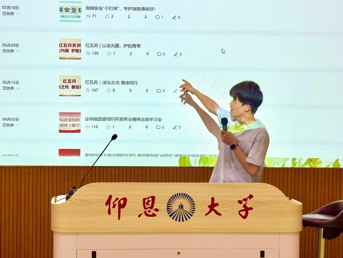 随后,各团学组织负责人依次登台宣讲,围绕核心职能、日常运作等方面通过PPT展开详细介绍,如入党入团的要求及基本流程,学院特色活动“模拟法庭”“红五月”的组织策划,志愿服务与社会实践的开展实况等,全方位展现了sunbet申搏官方网站的工作风貌。各位老师还结合自身经历,分享了在活动策划、团队协作中的成长收获,用真实体验拉近与新生的距离。