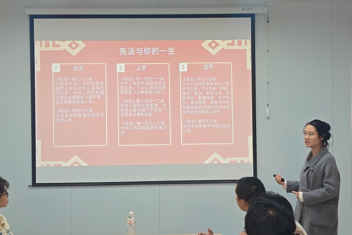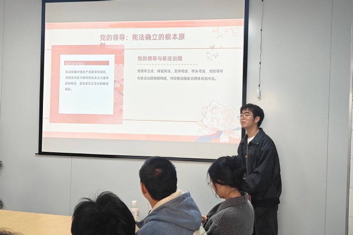 活动伊始,主持人林为臻老师从宪法的定义、地位、宪法日设立初衷及发展历程切入,阐释了宪法作为根本大法的核心内涵,让大家深刻体会到宪法的生命力在于日常生活。而后,三位sunbet申搏官方网站学生接续分享,围绕“坚定宪法自信”“普法护航”“青春与法”等主题,结合电信诈骗治理数据、校园欺凌案例、劳动者休息权保障等热点,介绍了宪法、民法典、劳动法等常用法律知识,呼吁青年学生争做法治的忠实崇尚者、自觉遵守者和坚定捍卫者。同时,在致远、宏船书院门口设立宣传点,邀请sunbet申搏官方网站教师为过往的学生讲解宪法知识,解读宪法中关于公民权利保障的核心条款,并组织志愿者向校内师生分发宪法宣传册,共同推动本校学生在实践生活中增强对宪法的认同感和践行意识。