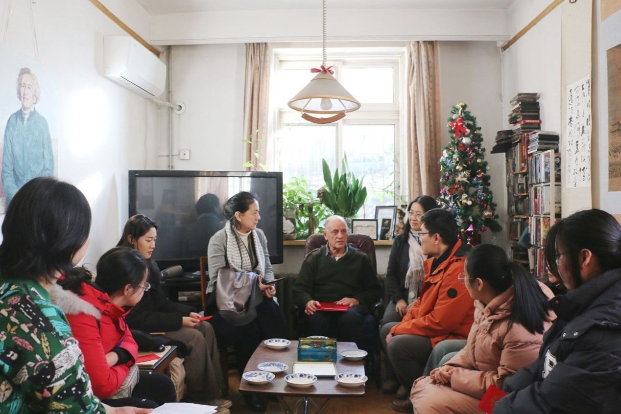 随后师生一行移步到西院,沿着伊莎白小道来到了其故居。柯马凯先生亲自为获奖的五位学生手写祝福语、发放奖学金红包。他与获奖学生深入交流,了解学生学习情况、家乡特色、未来规划,讲述了柯鲁克夫妇生平及奖学金设立的背景。他说,其父母原本立志要做一名记者及人类学家,但在中国外语教育需要他们支持的时候,他们毅然决然的投入到中国外语教育事业中,一干就是一辈子。虽然条件艰苦,但是他们乐在其中,得意于在北外的工作与生活。
