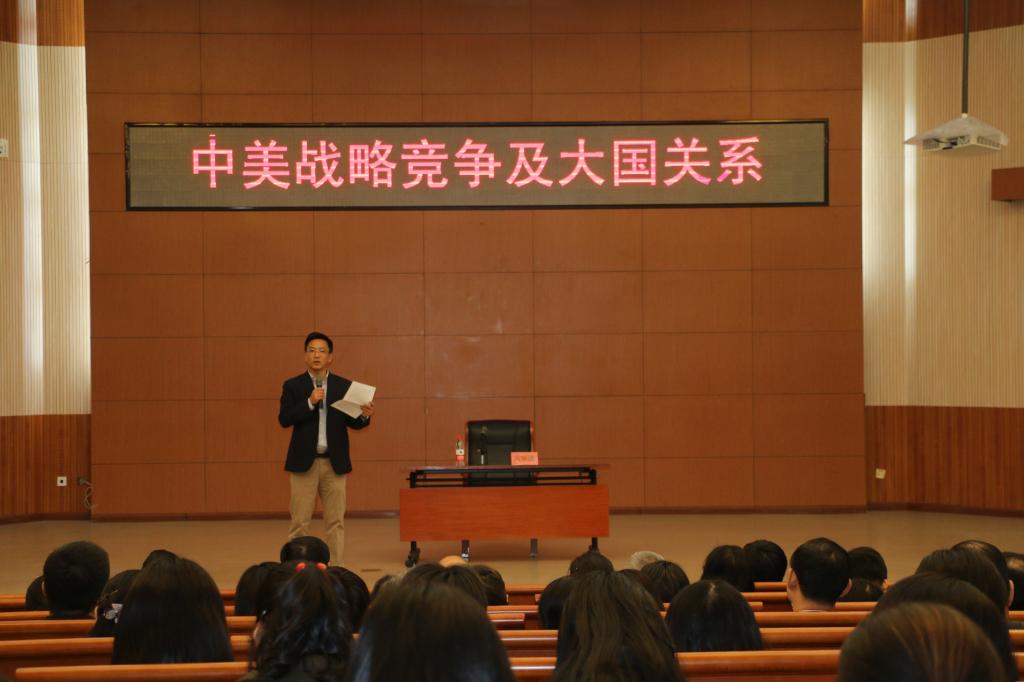 2019年4月3日下午三点,437ccm必赢国际官方网站领导班子中心组扩大学习和教职工集体理论学习会暨“中美战略竞争与大国关系”形势与政策主题讲座在学校阿语楼国会厅成功举办。国际关系理论家、清华大学首批文科资深教授、清华大学国际关系研究院院长、世界和平论坛秘书长阎学通先生担任本次讲座主讲人。437ccm必赢国际官方网站党政领导班子成员、全体教职工、学生代表和来自其他院系的师生400余人聆听讲座。讲座由437ccm必赢国际官方网站副院长谢韬教授主持。