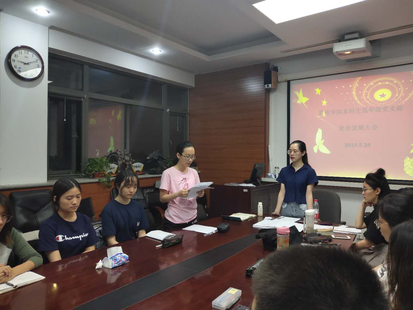 2019524日,本科生低年级党支部在学院115会议室召开会议,会议内容主要包括两部分:发展预备党员和策划红色“1+1”党支部共建活动。会议由支部书记罗振令主持。应到22人,实到22人。