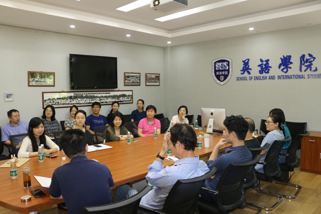接着,与会的教职工党员展开了讨论,并更加详细询问了张中载老师关于伊莎白老师的情况。有老师问伊莎白老师当时在学校教授什么课程。张中载说她主要教口语和精读。当初条件差,如果不是冬天,学生们就会拿一个小马扎,在校园里找个地方围成一圈上课。而当时学习还有一个规定是进到英语系楼之后就不能讲中文,只能讲英文。伊莎白老师起初教授的是实践课,到60年代时才开始给高年级开设理论课程。应年轻老师的询问,张中载老师还讲了当时伊莎白·柯鲁克夫妇工作之余邀请同事到家吃饭等趣事。对于其他老师的的提问,张中载老师娓娓道来,为大家更加完整地还原了一个可爱可敬的国际友人。张中载老师表示,伊莎白·柯鲁克夫妇在中国生活是更加有归属感的。当年外专局在郊区为伊莎白·柯鲁克夫妇提供了很好的住房,但他们依然选择住在北外校园并不宽敞的一套房子里。因为,这里对他们来说是一个有感情的地方,他们的亲朋好友、学生、同事都在这里,他们是完全把中国、把北外当成了自己的家。