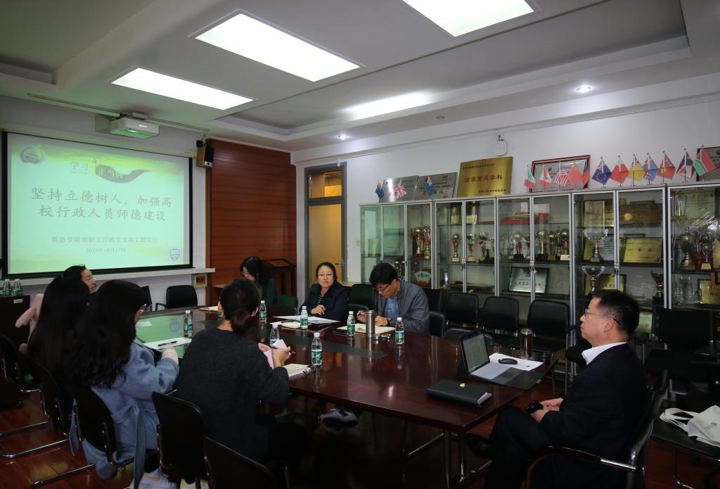 2019年10月17日下午,437ccm必赢国际官方网站教职工行政党支部在英语楼115会议室召开“坚持立德树人,加强高校行政人员师德建设”教育学习活动。