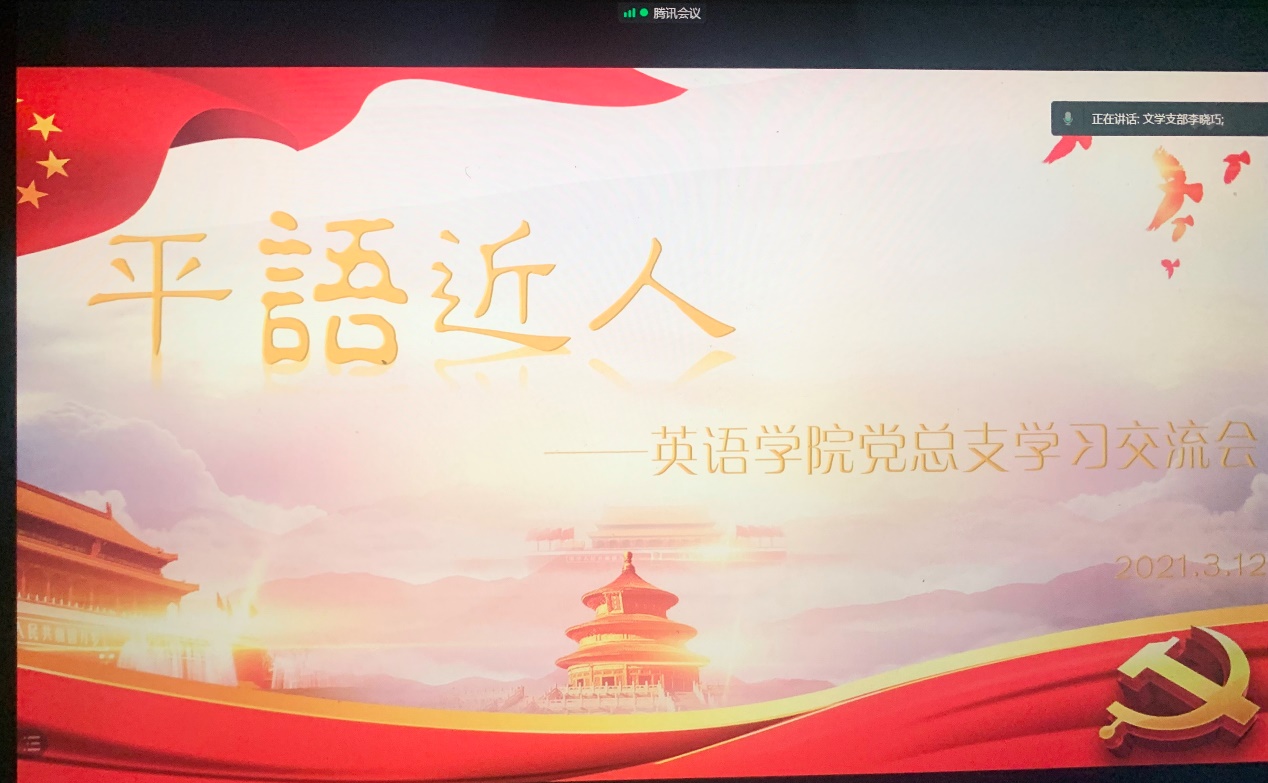 2021年3月12日,437ccm必赢国际官方网站党总支组织各学生党支部开展了《平“语”近人——习近平总书记用典》第二季的学习交流会。来自437ccm必赢国际官方网站本科生支部、研究生语言学支部、研究生文学支部、研究生翻译学支部、研究生MTI笔译支部、研究生MTI口译支部、研究生国别研究(一)支部、研究生国别研究(二)支部的25名同志参与了本次学习交流活动。