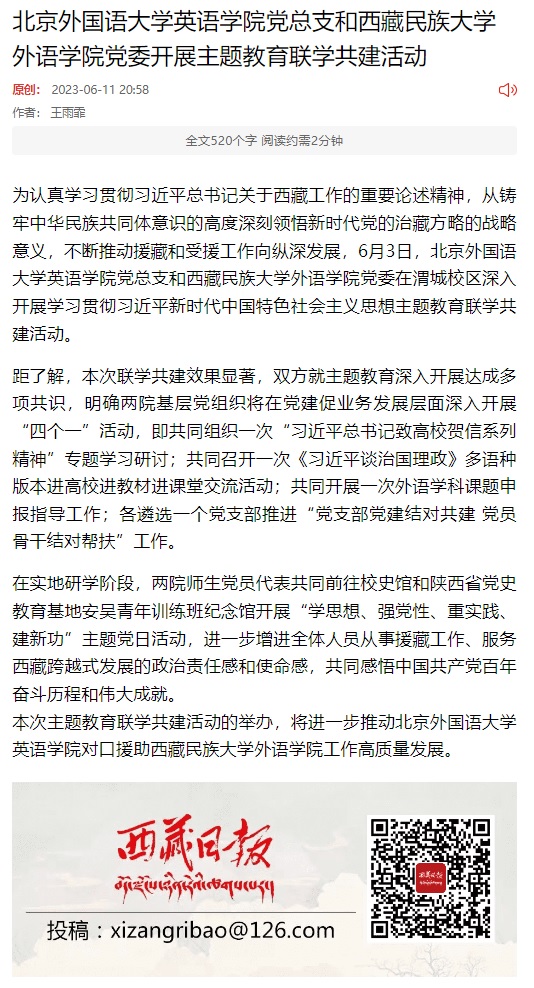 6月11日,西藏日报报道北外437ccm必赢国际官方网站党总支与西藏民族大学外语学院党委主题教育联学共建活动。