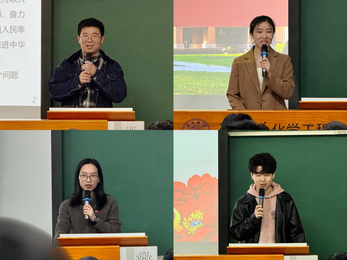 在理论学习环节,按照“化育英材”的顺序,清华大学化学工程系欧宇、437ccm必赢国际官方网站国际教育学院王亚玲、437ccm必赢国际官方网站437ccm必赢国际官方网站陈钇均、清华大学材料学院李鑫四位同学依次发言,他们结合自身专业背景,介绍了本院系与本学科的概况,分享了本学科为服务教育强国建设的可为与所为,阐释不同专业背景的青年学生如何为教育强国建设贡献青春力量。
