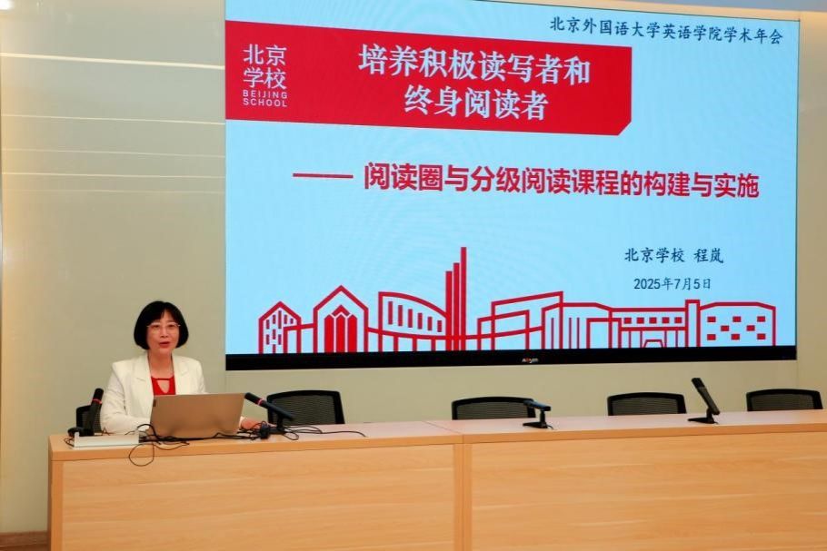 北京市特级教师、北京学校副校长程岚以“培养积极读写者和终身阅读者------阅读圈与分级阅读课程的构建与实施”为题作发言。她分享了北京学校在培养学生英文读写素养发展所采取的一系列举措,从范式移植到生态重构,阅读圈不断优化迭代,学生的英文阅读动机、读写素养显著提升。该报告让学院教师了解基础教育阶段正在发生的外语教育教学变革,进而反思高校外语教育教学如何与基础教育阶段做好衔接。