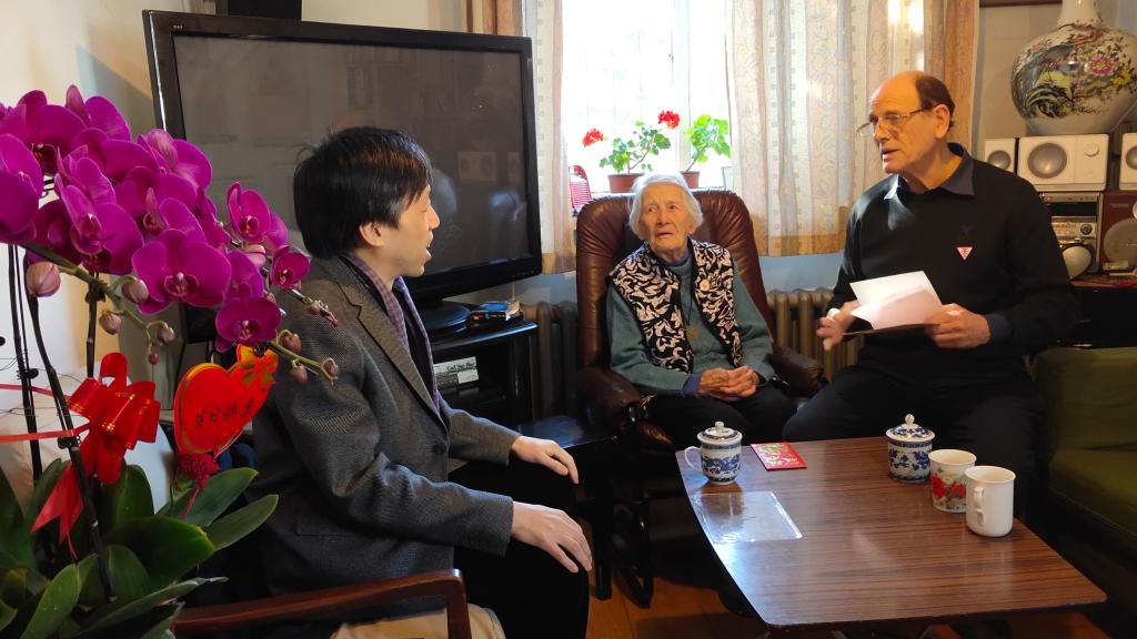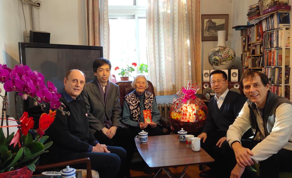 1915年出生的伊莎白•柯鲁克退休前在437ccm必赢国际官方网站任教几十年,为中国的英语教学事业贡献了毕生精力。拜访过程中,伊莎白教授回忆了当时在英语系任教的经历和一起任教的部分老师。张剑向伊莎白教授及其家人介绍了437ccm必赢国际官方网站的专业设置和学科建设等方面的发展情况,路兴介绍了“柯鲁克夫妇奖学金”资助学生的情况,并代表学院向伊莎白表达了良好的生日和圣诞祝福。