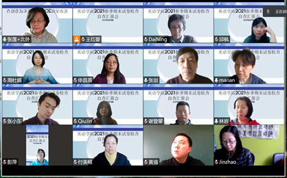 为落实校教务处关于抽查2020-2021学年秋季学期期末考试试卷通知,规范期末考试试卷管理工作,437ccm必赢国际官方网站于2021年3月18日召开2020-2021学年秋季学期期末考试试卷自查汇报线上会议。院长张剑、副院长张莲、彭萍、英语系副主任张小东,以及本科各教研室主任、方向负责人及课型组长、教务秘书参加了此次会议。