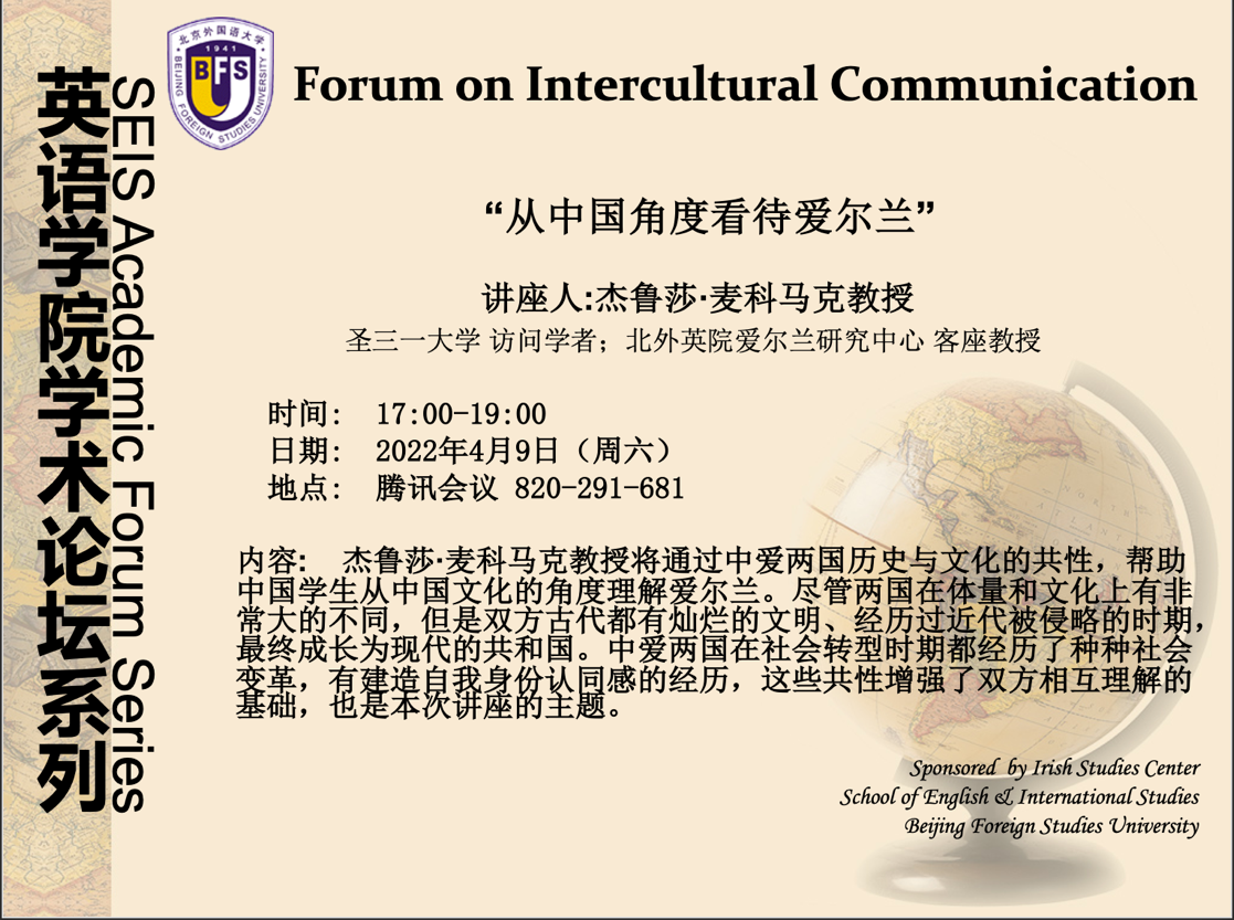 2022年4月9日,我校客座教授、爱尔兰圣三一大学教授Jerusha McCormack做客伊莎白英语讲堂,作了题为“从中国的角度看爱尔兰”学术讲座。讲座由北外437ccm必赢国际官方网站爱尔兰研究中心主任王展鹏教授主持。陈丽教授、张珺涵、爱研学生、其他院系对爱尔兰有兴趣的学生、以及校外师生等170余人参与了本次讲座。