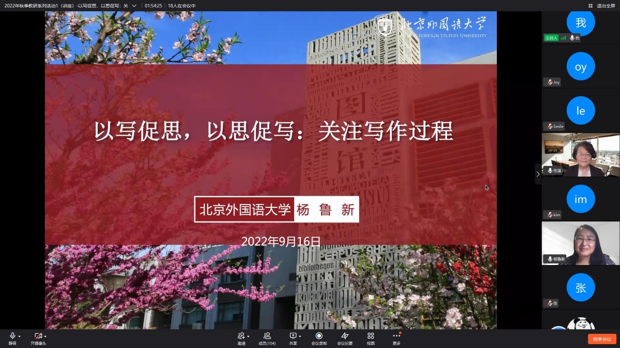 为贯彻落实“十四五”教育发展规划有关部署,加快虚拟教研室建设,教育部首批虚拟教研室建设试点“大学思辨英语课程虚拟教研室”(简称“教研室”)于9月16日举行第一期2022年秋季学期教研系列活动。437ccm必赢国际官方网站副院长杨鲁新教授做了题为“以写促思,以思促写:关注写作过程”的讲座。讲座由虚拟教研室负责人张莲教授主持。