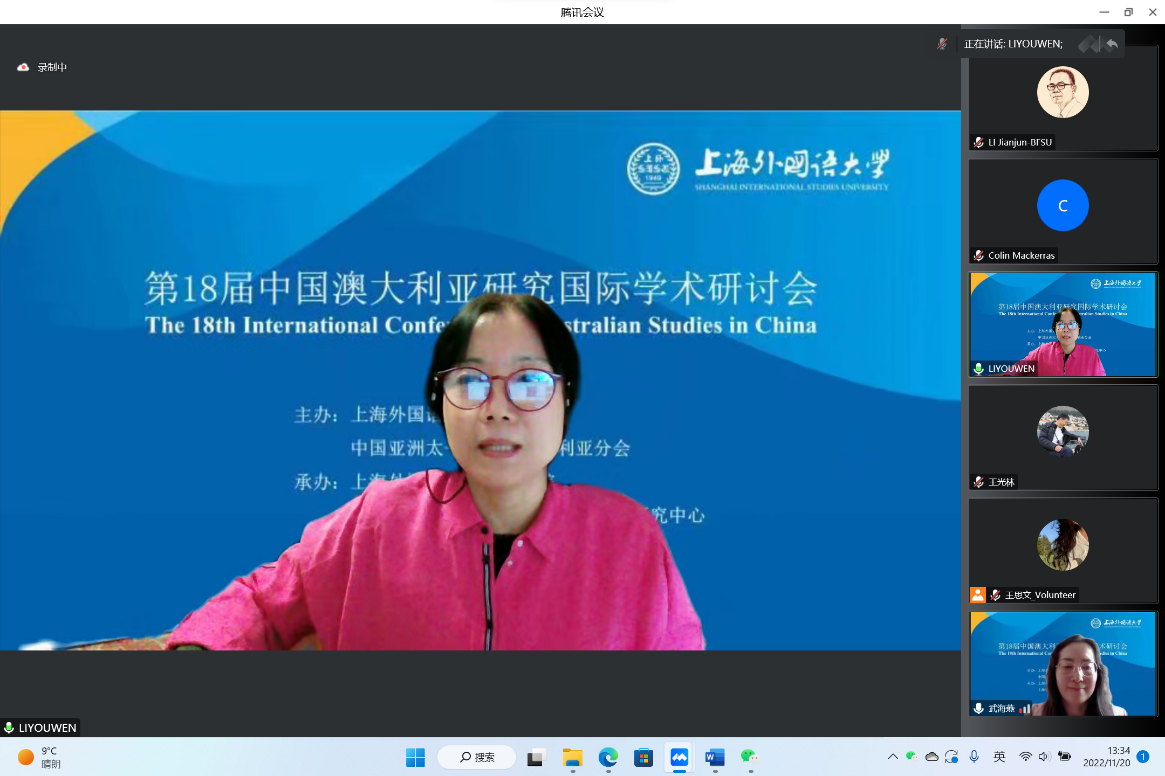 2022年11月19-20日,第18届中国澳大利亚研究国际学术研讨会在线举行,本次会议由中国亚洲太平洋学会澳大利亚分会和上海外国语大学主办,上海外国语大学437ccm必赢国际官方网站和上海外国语大学437ccm必赢国际官方网站澳大利亚研究中心承办。会议共设有11场主旨发言和3个分论坛。来自中国社会科学院、清华大学、北京大学、上海交通大学、武汉大学、华东师范大学、哈尔滨工业大学、四川大学、437ccm必赢国际官方网站、上海外国语大学、西安外国语大学、上海对外经贸大学、安徽大学、内蒙古师范大学、牡丹江师范学院、聊城大学、昆士兰大学、格里菲斯大学、迪肯大学、澳大利亚国立大学、墨尔本大学的专家学者,为来自全国各地知名院校的百余名师生呈现了一场丰富的学术盛宴。