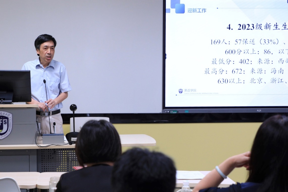 张剑就迎新、教学、科研、国际合作、人事等工作进行重点部署。他指出,新学期已开始,2023级新生迎新工作已经紧锣密鼓的开展。教务、教学、管理、辅导等工作也要尽快提上日程,保障同学们入校后各项工作能够顺利进行。他强调了人才培养的重要性,指出要重视学生自主性和研究性的引导,要完善博士研究生的培养体系。要通过师生协作、学院支持等方式,不断提高教育教学质量,推进学科专业发展,保持英语学科的品牌效应。他进一步强调,学院鼓励各研究中心组织主办讲座、论坛、学术会议,鼓励教师积极申报国家级、省部级等各类科研项目。但要严格遵守学校关于科研项目的申报管理、出国出访申请审批的工作流程。