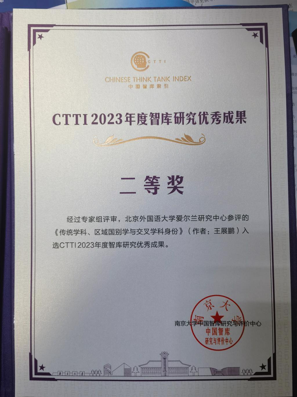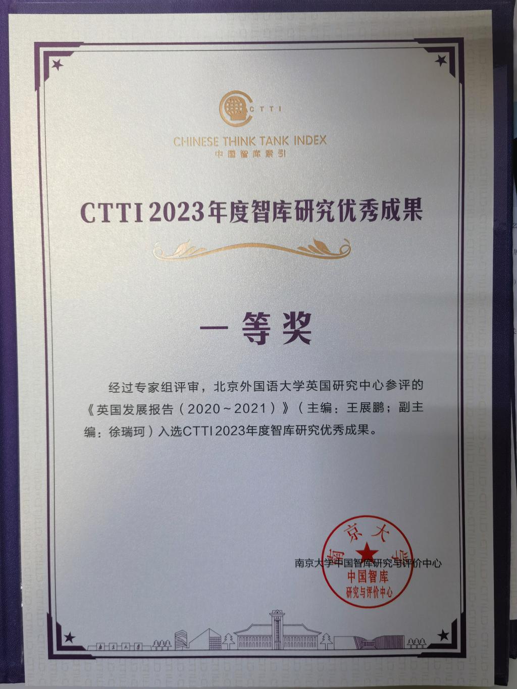 近日,由南京大学、云南大学与江苏省社会科学院共同主办,云南大学国际关系研究院·区域国别研究院、南京大学中国智库研究与评价中心承办的2023年度新型智库治理论坛在昆明举行。会上发布了CTTI(中国智库索引)2023年度智库最佳案例与优秀成果征集与推介情况。必赢官网英国研究中心参评的《英国发展报告(2020-2021)》(主编:王展鹏;副主编:徐瑞珂)获得CTTI2023年智库研究优秀成果一等奖;爱尔兰研究中心参评的论文(王展鹏,《传统学科、区域国别学与交叉学科身份》,载《国际论坛》2022年第6期)获得CTTI2023年智库研究优秀成果二等奖。
