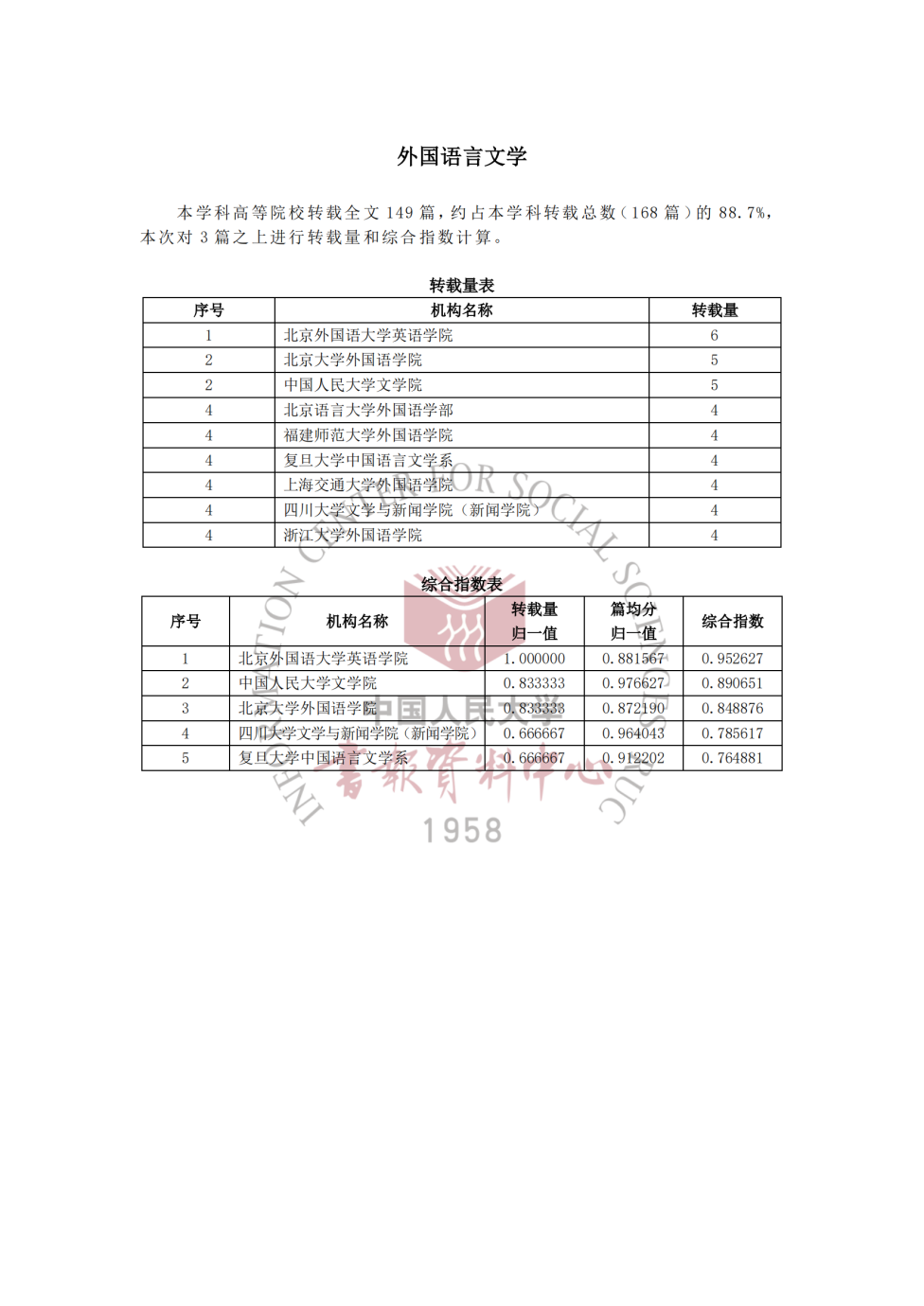 中国人民大学书报资料中心复印报刊资料有近100种学术系列刊,是从国内公开出版的近4000种期刊(含集刊)和报纸上精选人文社科研究成果,并按学科门类进行分类、编辑、出版的二次文献专题期刊。复印报刊资料客观上兼具资料与评价功能,成为评价人文社科研究成果、期刊、教学科研机构、作者等学术影响力和水平的参考依据之一。该转载指数至今已连续24年在《光明日报》等媒体公开发表,基本客观地反映了中国人文社科学术期刊、教学科研机构的学术研究水平。