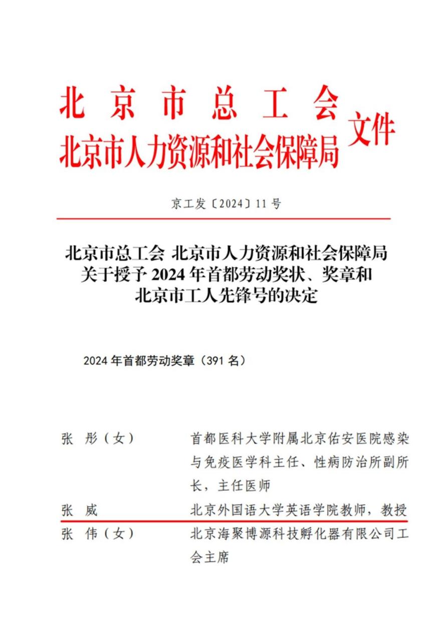 为深入学习贯彻党的二十大精神和中国工会第十八次全国代表大会精神,大力弘扬劳模精神、劳动精神、工匠精神,近日,北京市总工会、北京市人力资源和社会保障局在全市范围内开展2024年首都劳动奖状、奖章和北京市工人先锋号推荐评选工作,最终授予北京市76个单位“首都劳动奖状”称号,391名同志“首都劳动奖章”称号,授予148个班组(团队)“北京市工人先锋号”称号。437ccm必赢国际官方网站437ccm必赢国际官方网站张威教授荣获“首都劳动奖章”,这是北外教师首次获得该荣誉。