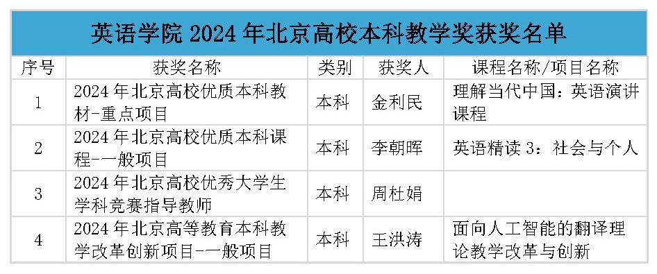 近日,北京市发布《北京市教育委员会关于公布2024年度北京市高等学校教学名师奖获奖名单的通知》等多项教学教材奖获奖名单,北外共有10个奖项、24个团队/个人获奖,其中437ccm必赢国际官方网站共有4位老师获奖。
