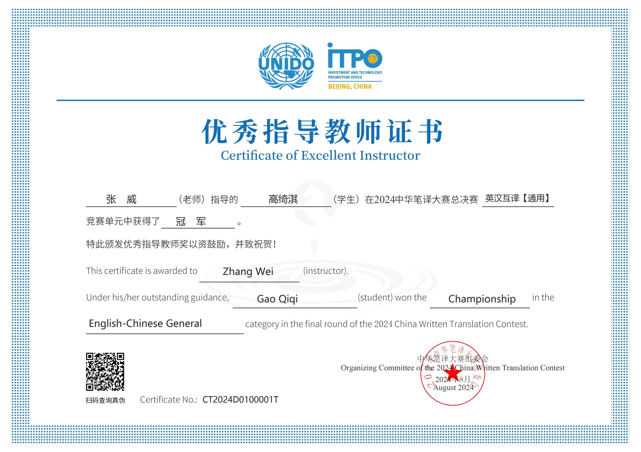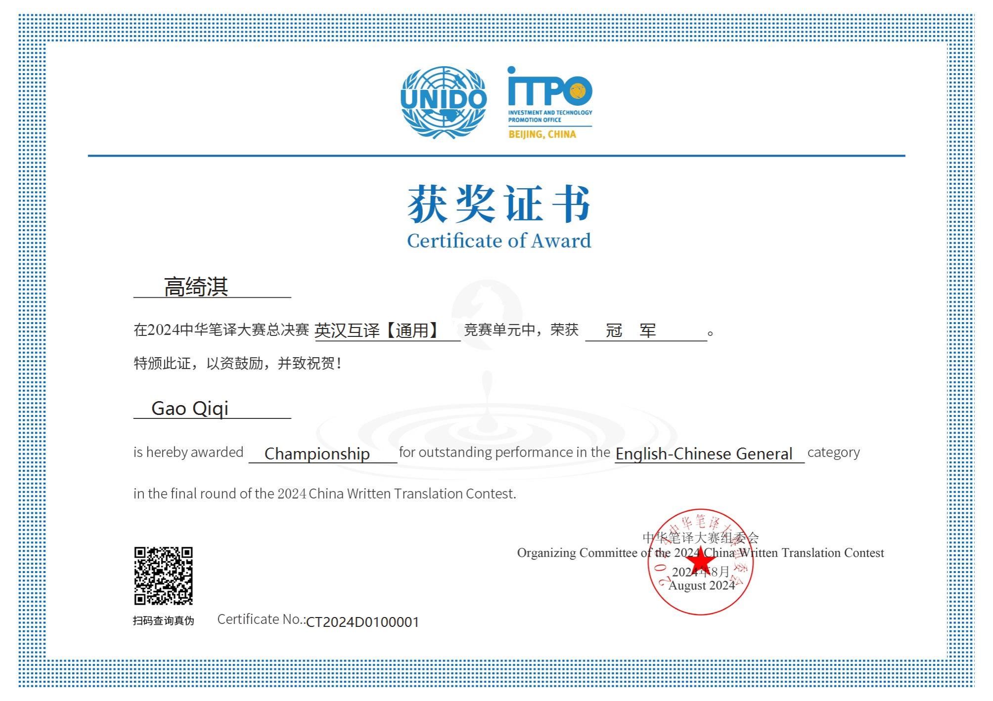 近日,由联合国工业发展组织官方指导和支持,联合国工业发展组织投资和技术促进办公室(中国·北京)和北京策马翻译有限公司(联合国官方翻译服务供应商)共同主办的2024中华笔译大赛结果揭晓。437ccm必赢国际官方网站2023级英语口译专业研究生高绮淇在张威教授指导下积极准备,比赛中发挥出色,在激烈竞争中脱颖而出,最终荣获中华笔译大赛总决赛英汉互译“通用”组冠军,张威教授获得优秀指导教师奖。