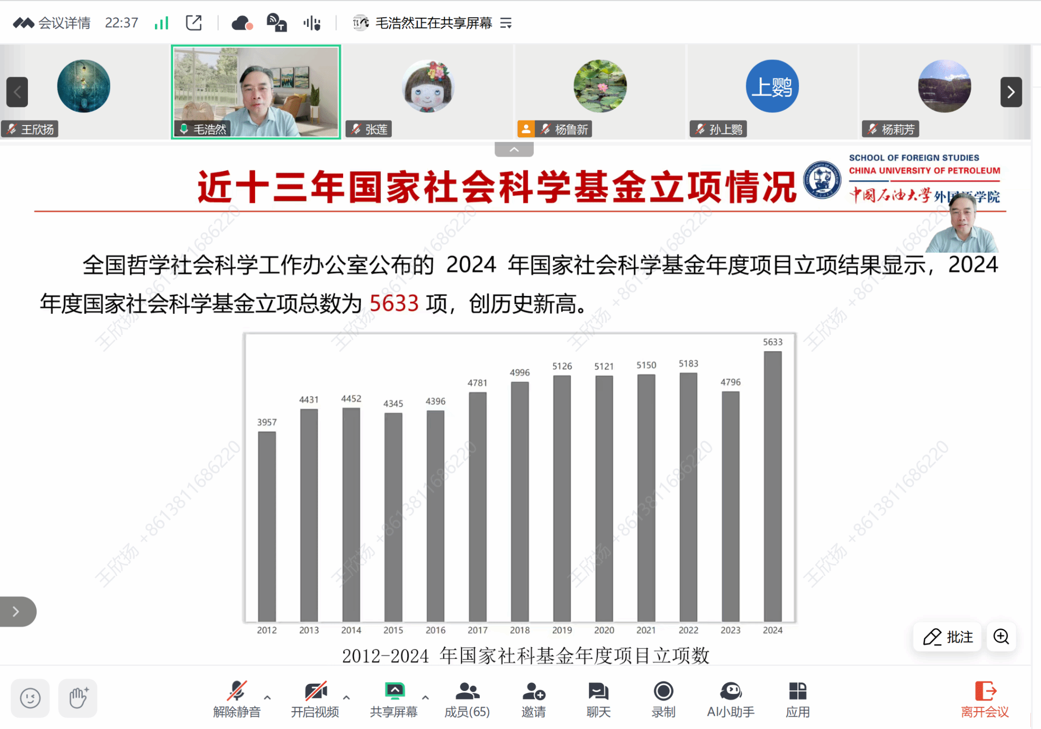 2025年4月1日下午,437ccm必赢国际官方网站437ccm必赢国际官方网站教师发展中心组织了一场国家社科基金申报专题讲座。活动邀请中国石油大学(华东)外国语学院院长、教授、博士生导师毛浩然,以“2025年国家社科重点方向解读与热点选题推荐”为题为学院教师讲解国家社科基金申报的最新动态与策略。