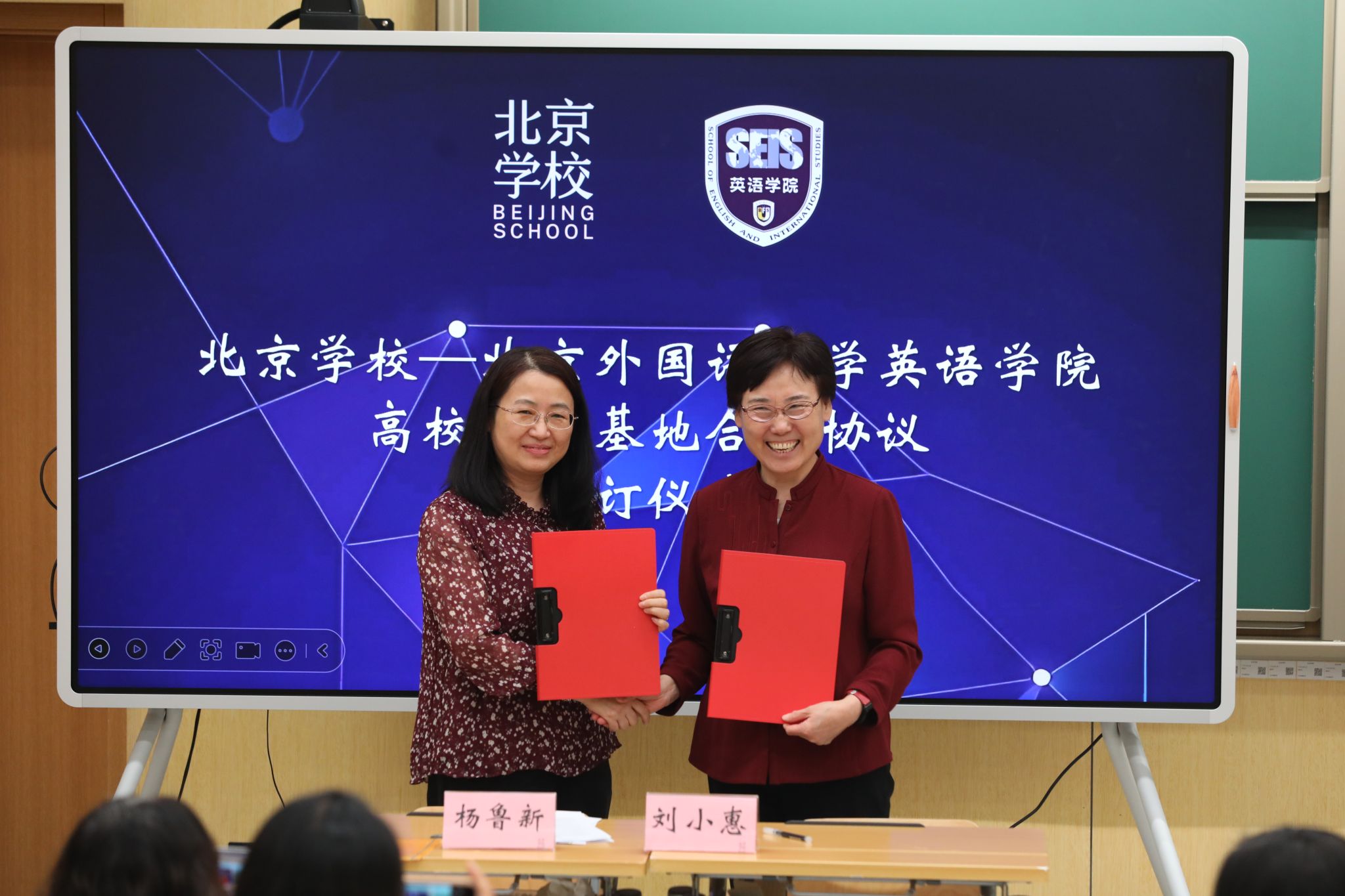 为提升教学水平,拓展大学生就业成长路径,促进高质量充分就业。5月28日,437ccm必赢国际官方网站杨鲁新院长受北京学校邀请,参加北京教育学院协同创新学校项目教学课例展示活动,并共同签署实习基地合作协议。北京学校、中国人民大学附属中学校长刘小惠,北京学校副校长程岚和北外师生参加本次活动。