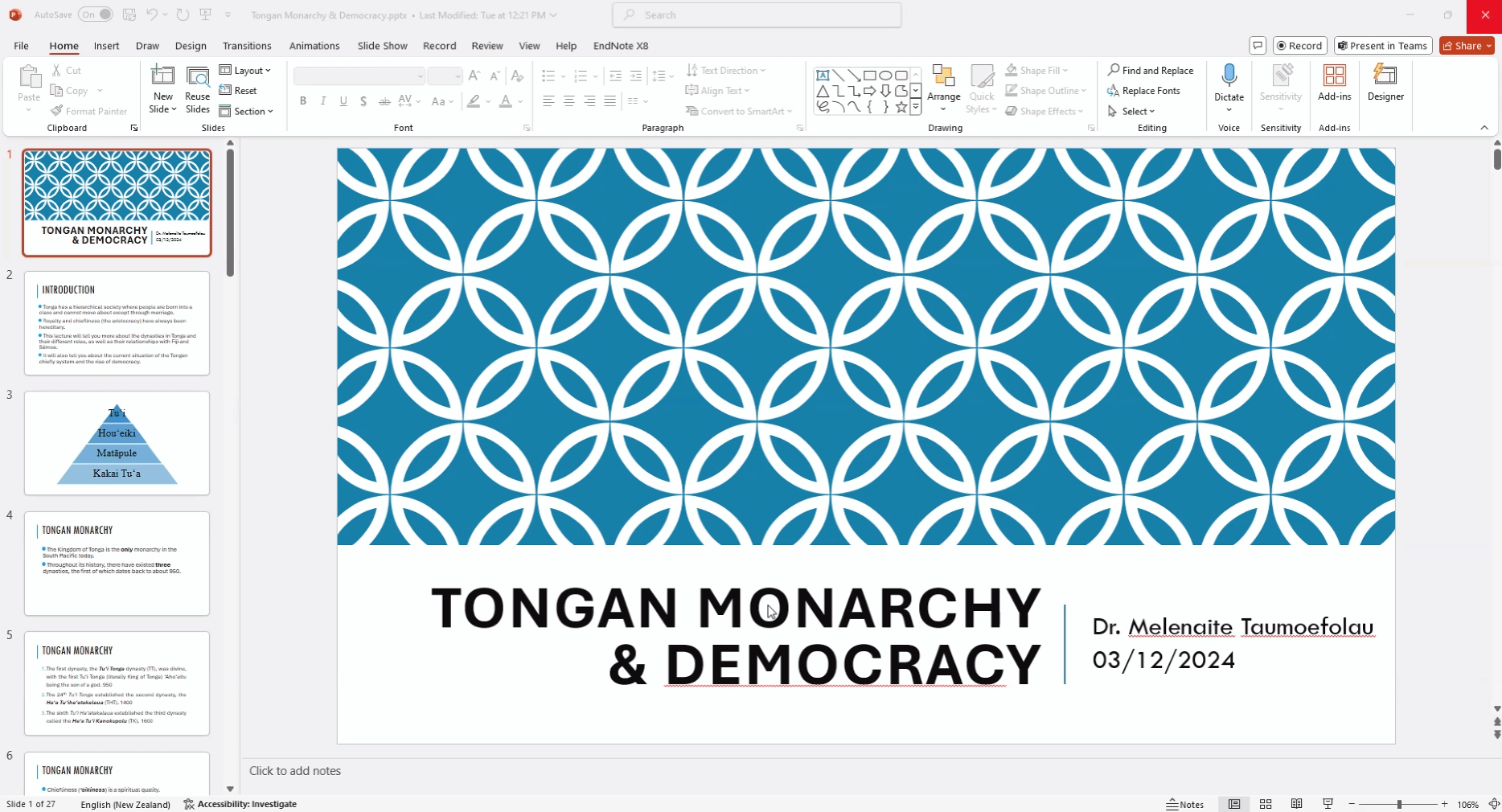 塔乌莫艾富拉乌博士首先对汤加王国作为当今南太平洋地区唯一的君主制国家进行了简单介绍。她指出汤加是一个等级森严的社会,王室和贵族地位世袭,普通民众除非通过婚姻,否则无法实现阶层的跨越。接下来,塔乌莫艾富拉乌博士分别介绍了汤加王国历经的三个王朝。为巩固权力,三个王朝间相互联姻。不仅如此,汤加王室公主还和斐济、萨摩亚等国的贵族进行联姻。最后,塔乌莫艾富拉乌博士对汤加贵族制度的现状及民主的兴起进行了简要介绍。