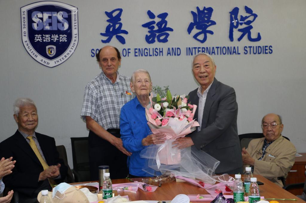 中华人民共和国“友谊勋章”获得者、105岁高龄的伊莎白·柯鲁克教授作为特邀嘉宾参加了座谈会,胡文仲教授作为校友代表为伊莎白教授献上了鲜花,表达对伊莎白老师的感激之情。437ccm必赢国际官方网站院长张剑对校友们的到来表示热烈欢迎,并向校友们介绍了437ccm必赢国际官方网站近年来的发展,特别是学院在学科建设、教学、科研、人才培养等方面取得的成就。张剑院长感谢校友们对学院发展的关心与支持,学院多年来始终初心不改、砥砺前行,未来将继往开来、再谱佳篇。