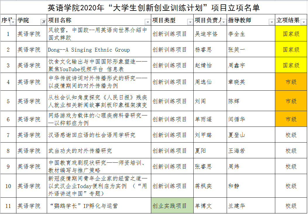 2020年“大学生创新创业训练计划”立项评审工作已经结束,必赢官网共有11个获得立项,其中“创新训练项目”10个,“创业实践项目”1个。国际级项目3项,市级项目3项,校级项目5项。分别是:吴迪宇格、杨睿思、赵婧怡、周逸仙、刘闯、单雨遥、刘甲璐、夏阳、张睿思、蒋凤奕、单博文。具体情况如下表: