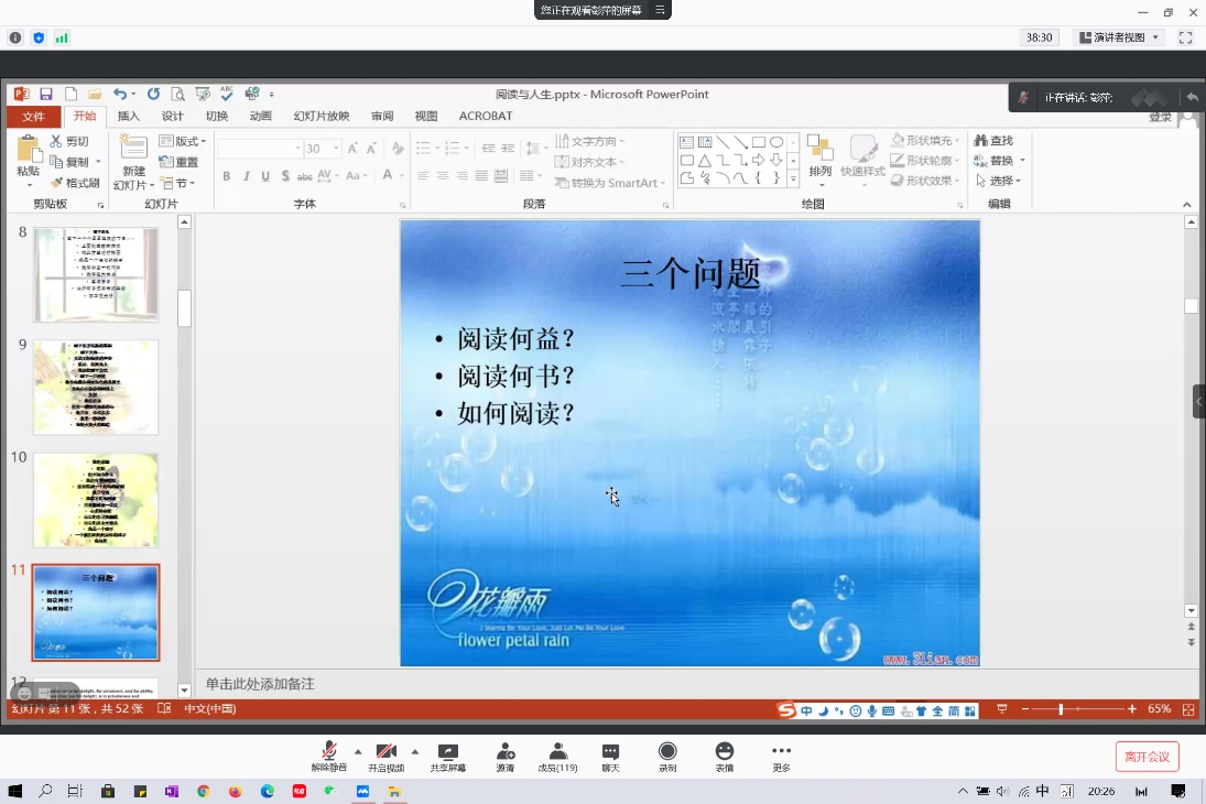历经一个半小时后,437ccm必赢国际官方网站“阅读与人生”专题讲座最终圆满落下帷幕。通过此次讲座,同学们切实感受到阅读的乐趣,同时也掌握了有效的阅读方法,对阅读与人生的关系有了进一步的思考。红日初升,其道大光。作为新时代的青年,同学们应胸怀理想,脚踏实地,笃志虚心,循序渐进,用书籍指明人生的方向,用书籍搭建梦想的阶梯。