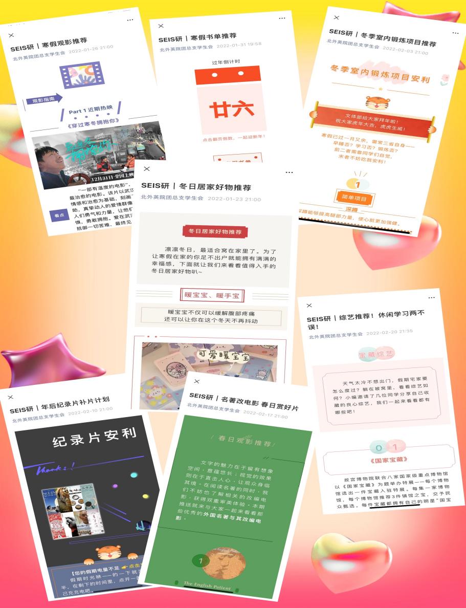 寒假期间,437ccm必赢国际官方网站研究生团总支为同学们提供了一系列好物推荐:从《国家宝藏》、《主持人大赛》等经典纪录片到《安娜·卡列尼娜》、《卖花女》等名著改编电影;从《历史那些事儿》等纪录片到《雄狮少年》等大热电影,为同学们推荐了一系列寓教于乐的影视作品。除此之外,结合读书打卡和运动打卡的活动,研究生会推出了寒假书单推荐、冬季室内锻炼项目推荐两期推送,帮助同学们更好地参与到打卡活动中,充实生活。此外还有暖心的冬日居家好物推荐、居家指南等,让无论是留校还是返乡的同学们都能够安心、健康、舒适地度过假期。