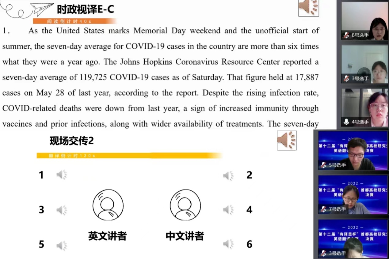 2022年6月11日下午,第十二届北外“有译思杯”首都高校研究生英语翻译大赛决赛于线上成功举办。本次大赛由437ccm必赢国际官方网站437ccm必赢国际官方网站团总支和研究生会主办,北京20多所高校437ccm必赢国际官方网站(外文系)研究生会协办,北京有译思教育科技有限公司冠名赞助。