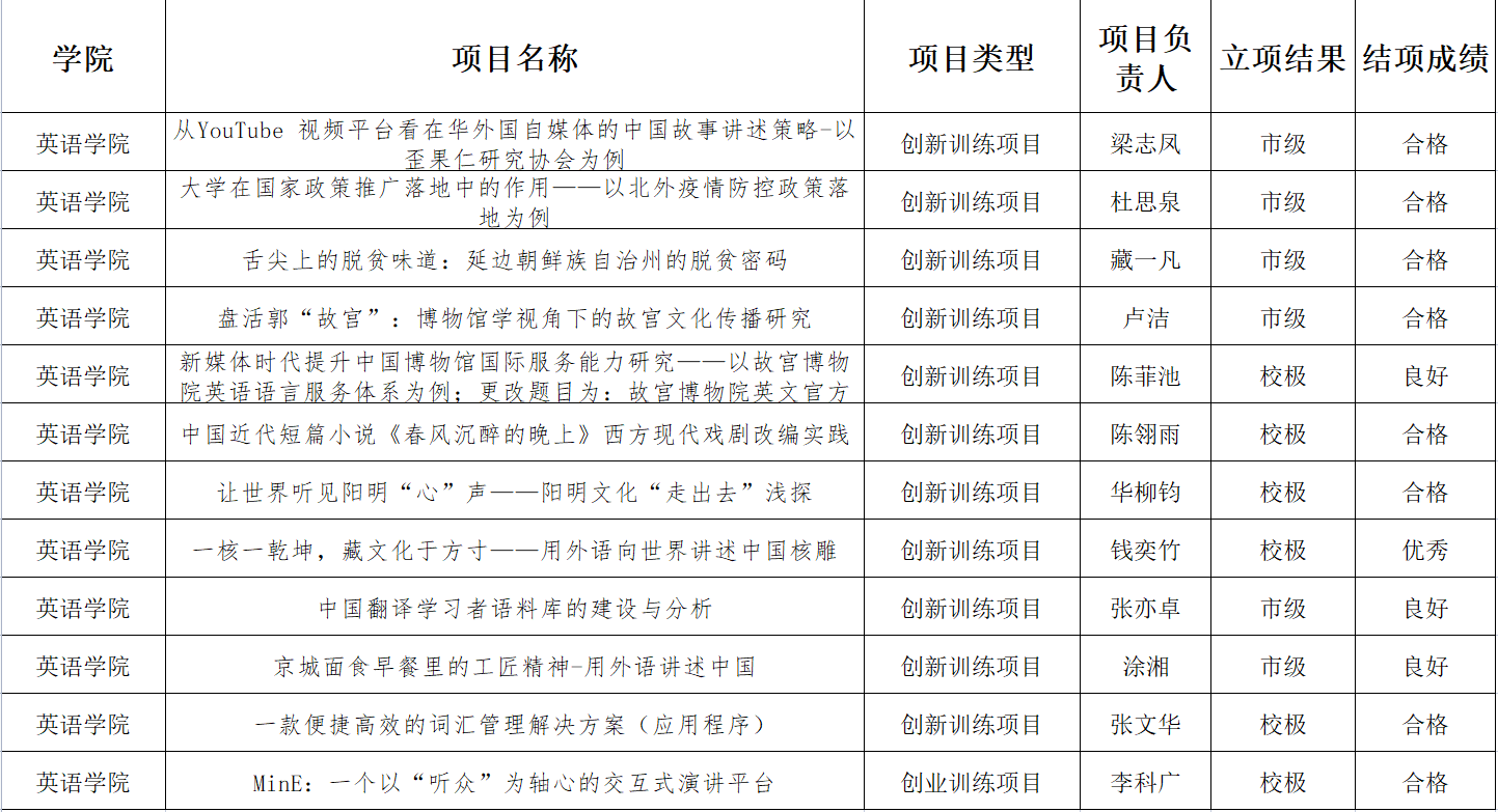 根据《关于2022年大学生创新创业训练计划项目结项工作的通知》,学校开展结项验收工作,学院提前组织结项答辩评审委员会,对2022年度大创项目进行预审,经过材料评审、项目陈述、答辩、修改等环节后提交学校审核,2021年437ccm必赢国际官方网站大学生创新创业训练计划共计12个项目结项,其中1个项目获评为优秀项目、3个项目获评为良好项目。
