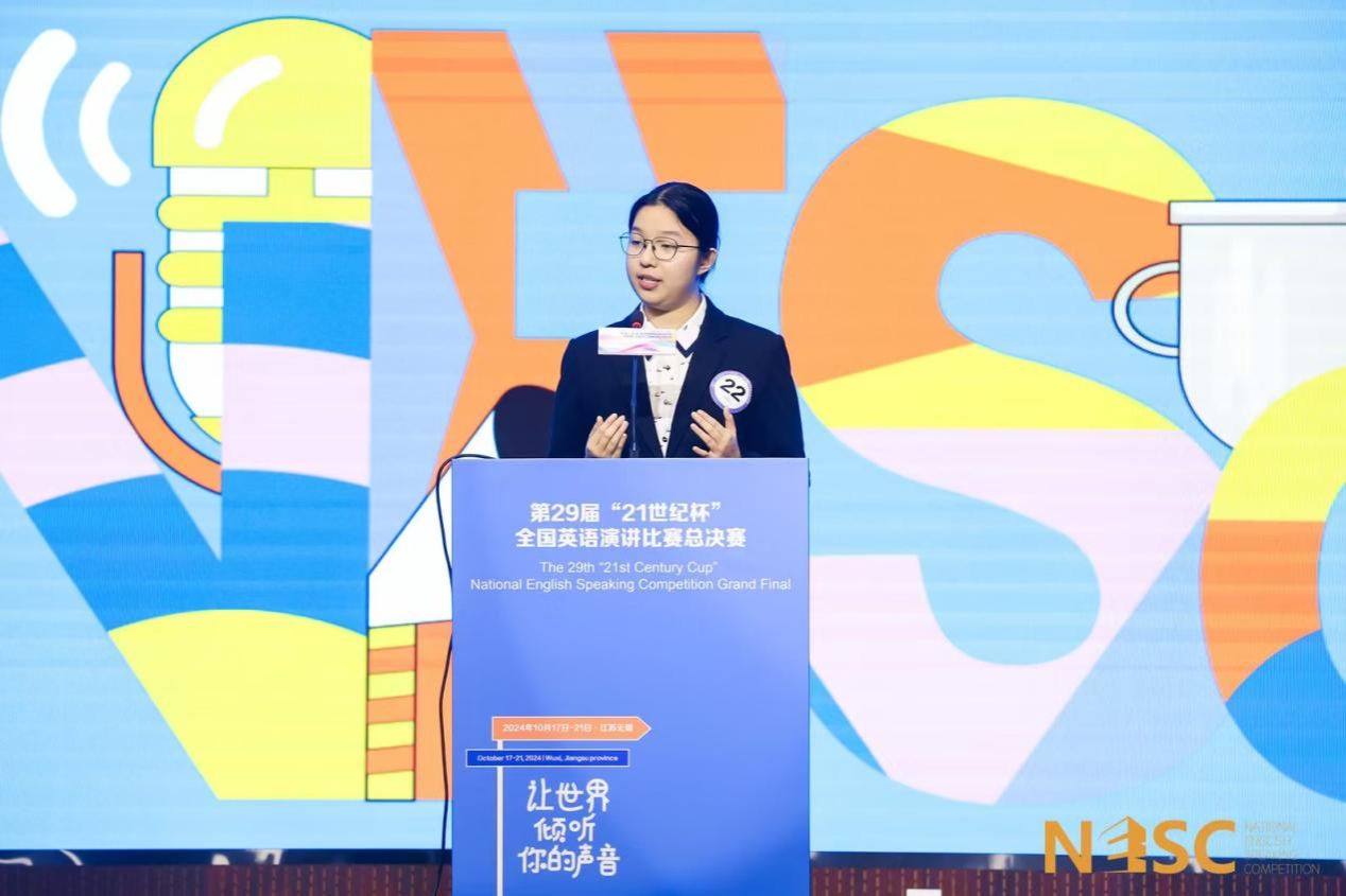 2024年10月17日-21日,437ccm必赢国际官方网站本科生陈惜缘参加了在江苏无锡举办的第29届“21世纪杯”全国英语演讲比赛。她通过在两轮半决赛和决赛中的优异表现,最终斩获了全国一等奖(列第四名)的好成绩。