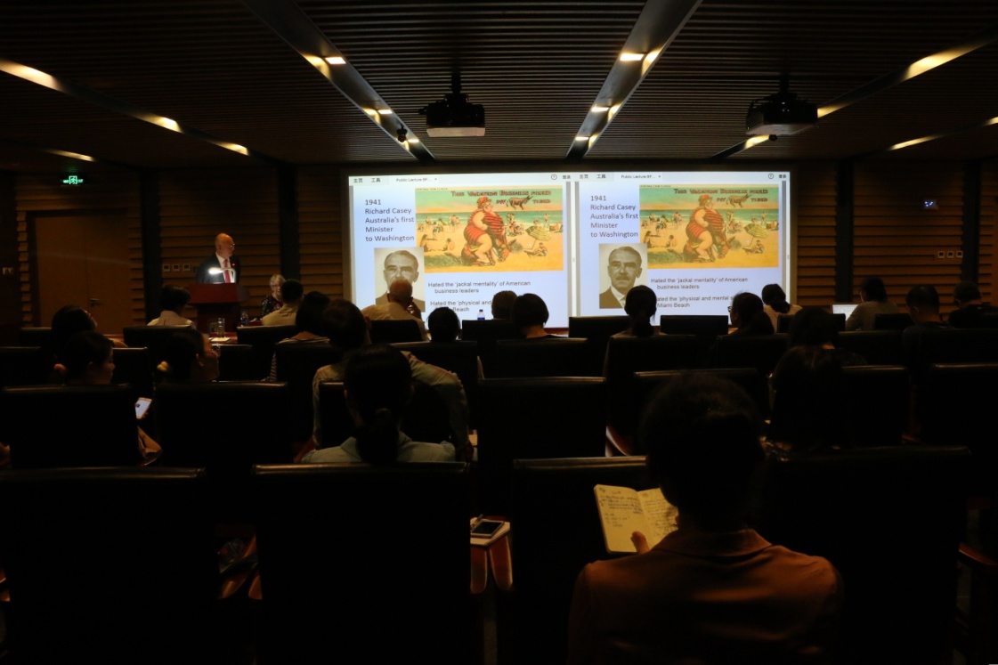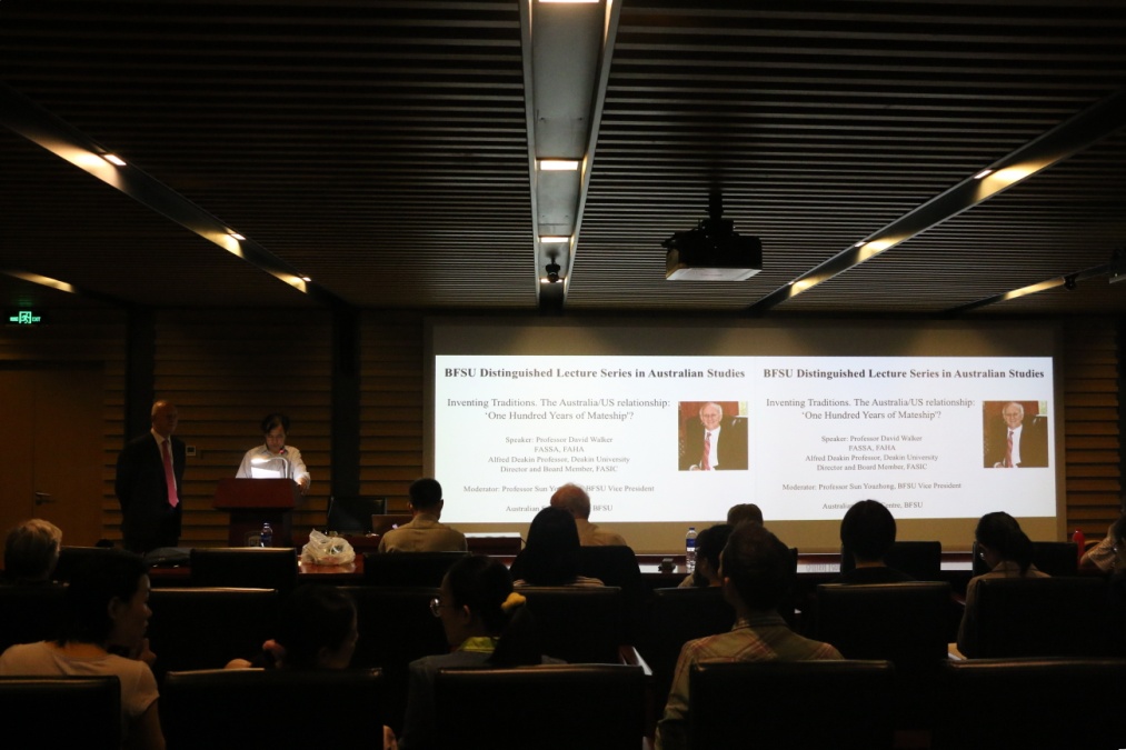 ——5月15日晚7点“北外澳研大讲堂”(BFSU Distinguished Lecture Series in Australian Studies)第一讲在北外图书馆四层学术报告厅隆重举行,我校客座教授、澳大利亚社会科学院院士、澳大利亚人文科学院院士、迪肯大学荣休教授大卫•沃克(David Walker)作了题为“澳美关系:100年的伙伴情谊?”(The Australia US Relationship: One Hundred Years of Mateship?)的讲座。讲座由437ccm必赢国际官方网站澳研中心主办,437ccm必赢国际官方网站副校长孙有中教授主持。