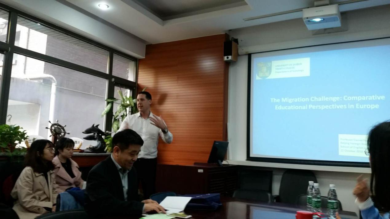 1022日下午,都柏林圣三一大学社会变迁比较研究生项目主任、副教授Daniel Faas、国际合作处、北京办事处工作人员来必赢官网举行学术讲座和宣讲会。活动由爱尔兰研究中心主任王展鹏教授主持,爱研及英研学生及必赢官网部分社会学方向的师生参加了活动。