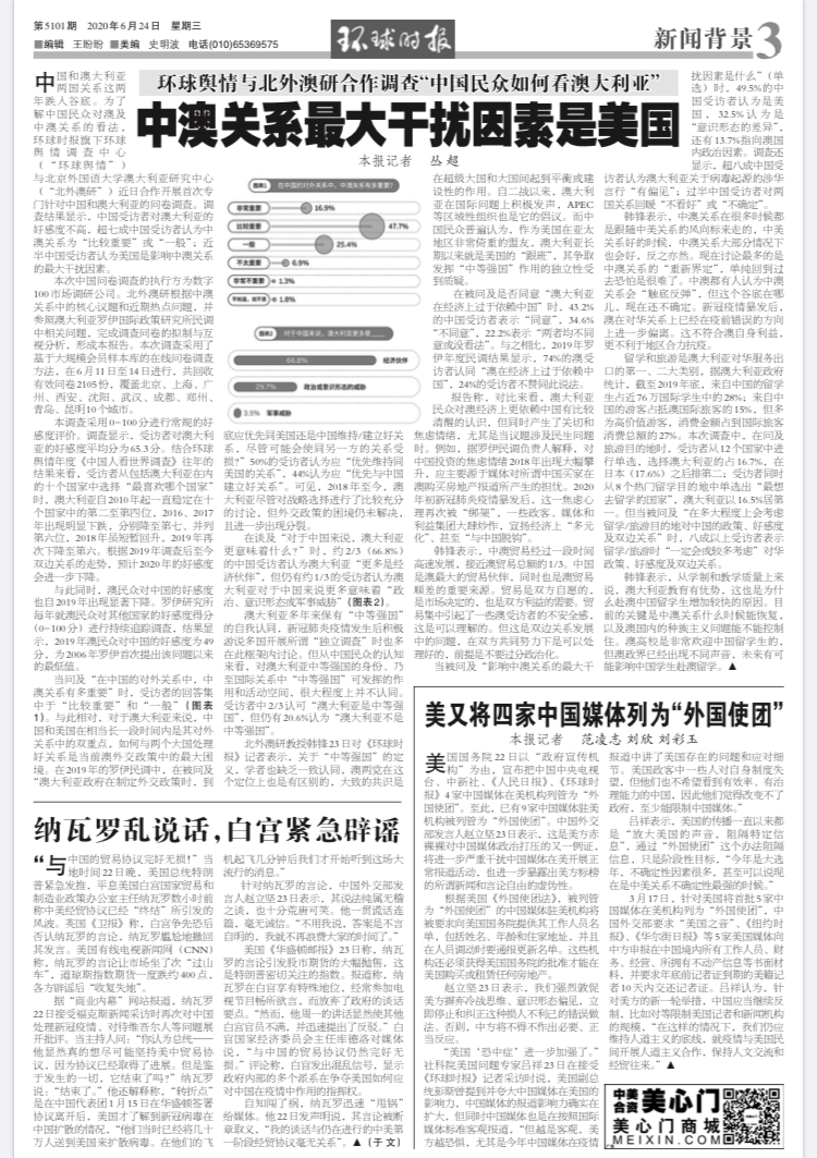 6月24日,必赢官网澳大利亚研究中心同《环球时报》旗下舆情调查中心合作,启动国内首个“中国民众看澳大利亚”民调项目,中澳多家主要媒体进行报道。