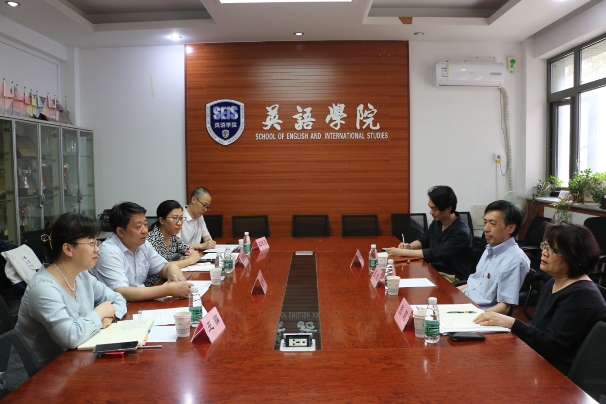 6月8日北京师范大学外国语言文学学院院长苗兴伟、党委副书记张新颖、副院长王楠、王德亮来访必赢官网调研座谈。院长张剑、副院长张莲、英语系副系主任张小东参加会议。