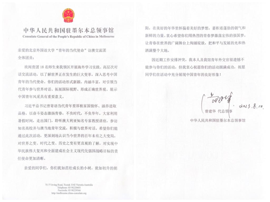 8月10日,中国驻墨尔本总领事馆为我校“青年的当代使命”学生海外实践团发来寄语。