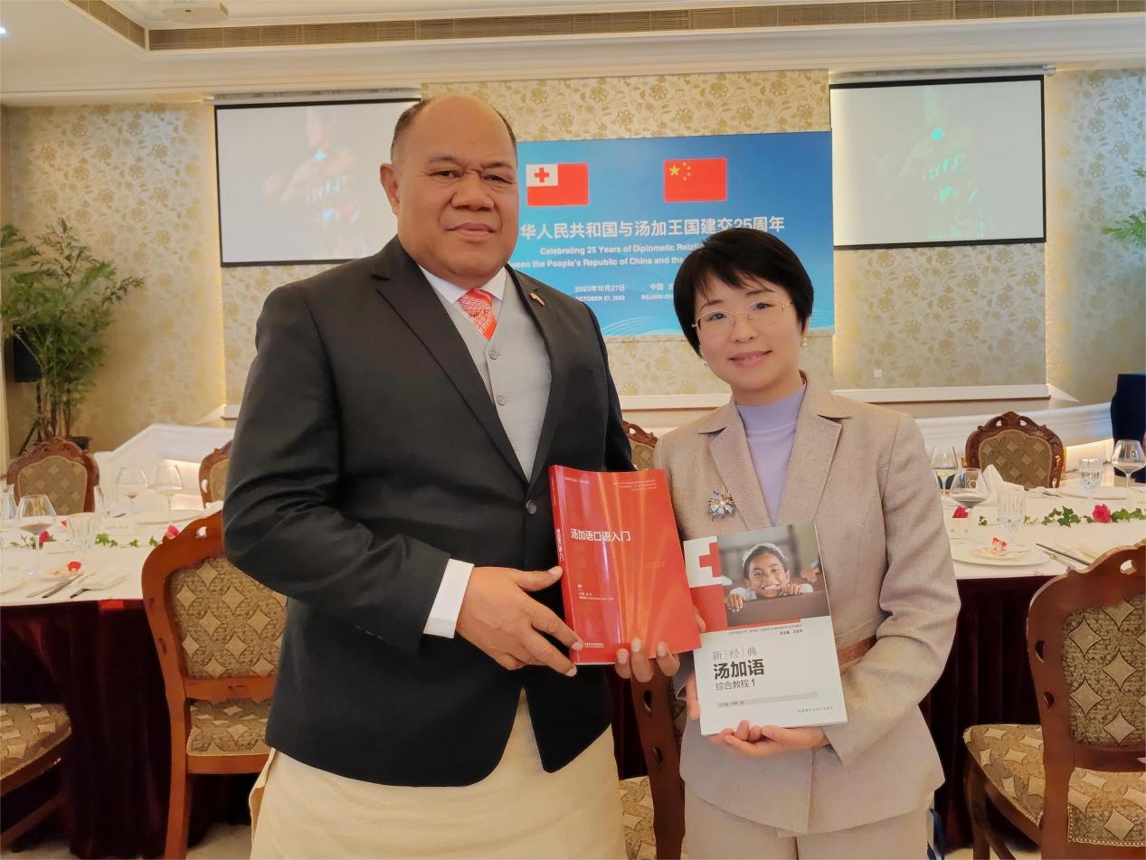 友协副会长姜江、汤加王国驻华大使陶阿伊卡·乌塔阿图在招待会上致辞。437ccm必赢国际官方网站王文丽老师作为高校代表、国内首部汤加语教材编写者受邀出席招待会。王文丽老师向中外嘉宾展示了外研社今年出版的两部汤加语教材--《汤加语口语入门》《新经典汤加语综合教程(一)》,并介绍了437ccm必赢国际官方网站建设八门南太非通语种专业的工作进展。与会嘉宾纷纷表示赞叹和祝贺,汤加大使对两部教材给予了高度认可与赞扬。