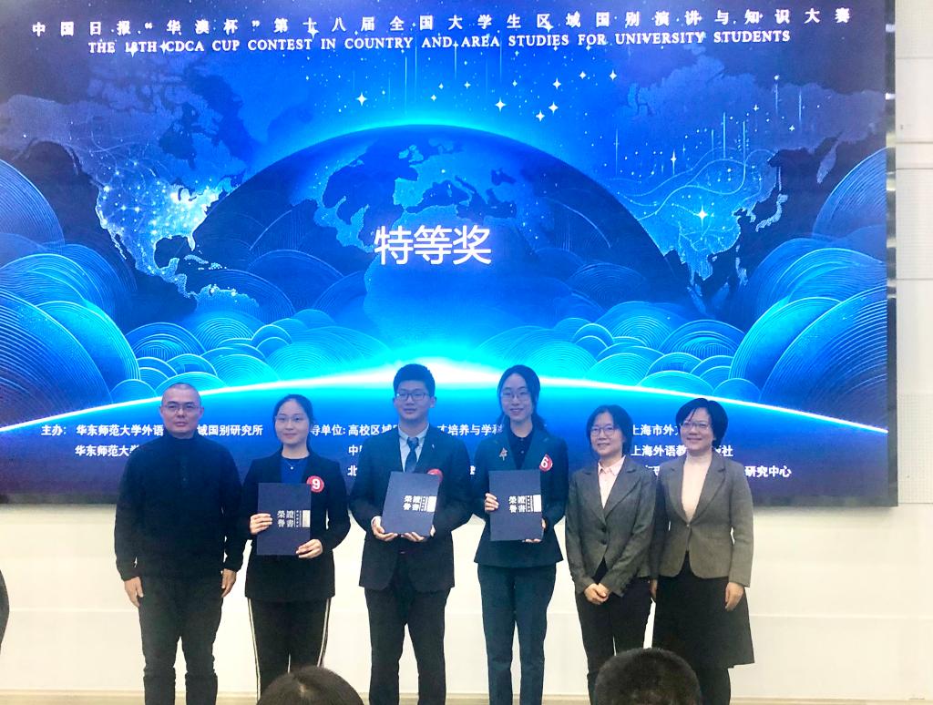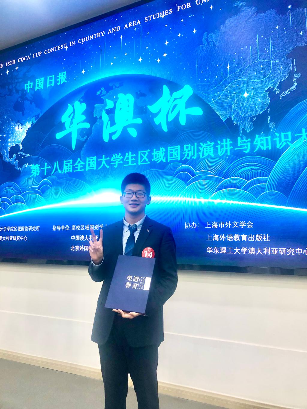 12月2日,由华东师范大学澳大利亚研究中心和华东师范大学外语学院区域国别研究所主办,上海市外文学会、华东理工大学澳大利亚研究中心和上海外语教育出版社协办的《中国日报》“华澳杯”第十八届全国大学生区域国别演讲与知识大赛圆满落幕。437ccm必赢国际官方网站2023级本科生屈浩洋在激烈的比赛竞争中脱颖而出,勇夺冠军,荣获特等奖。屈浩洋指导教师为周杜娟老师。