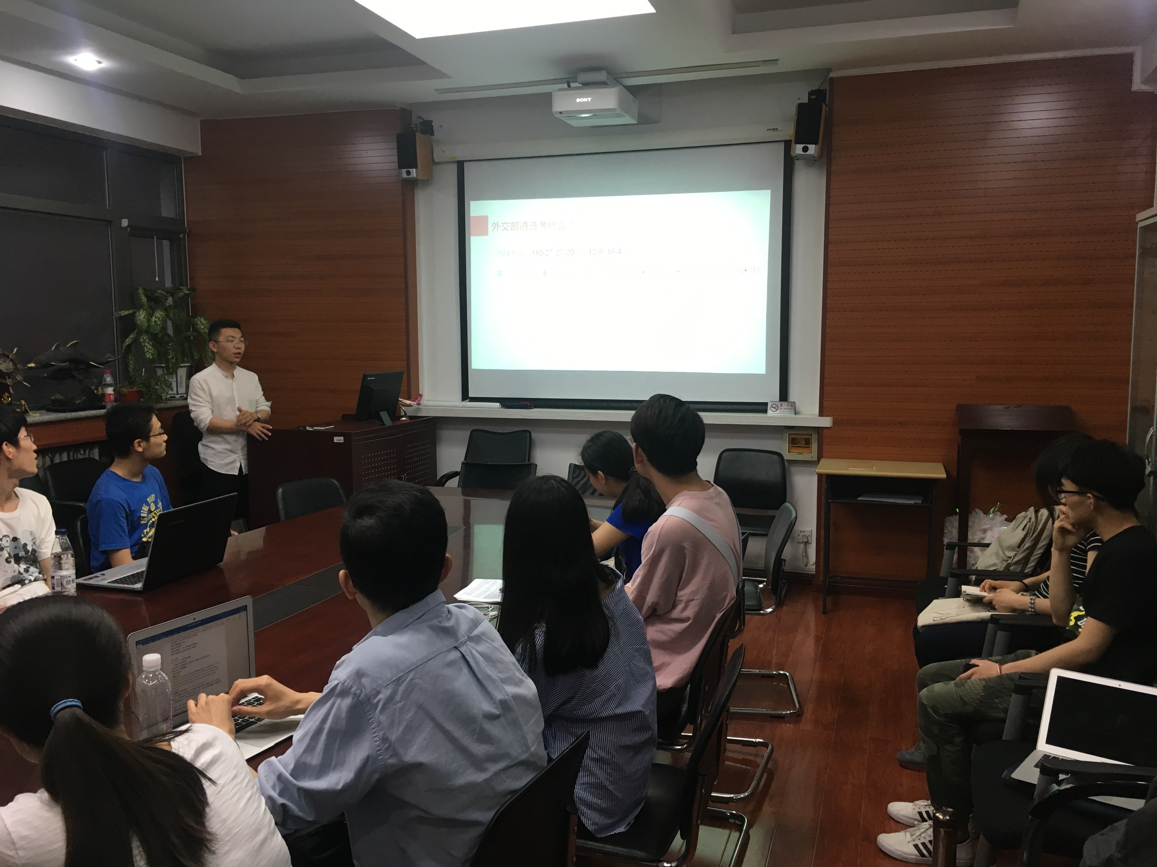 ——张文凯同学对2017年外交部遴选考试内容,进行详细的分析,使应考同学对考试难度、考试形式等有直观的了解。随后张文凯同学为大家进行了考前准备、心态调整、复习策略等方面的指导。徐浪同学为大家介绍了2017年外交部选拔考试内容之一视译部分,讲解和分享了视译的一些技巧、策略。崔心仪同学为大家分享了考前的一些具体准备事项,如新闻时事的积累准备、口译方面的训练、考试流程、考官考察事项等。