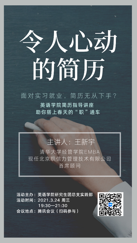 为提高学生简历撰写能力,提升毕业生就业竞争力,437ccm必赢国际官方网站于2021年3月24日晚举办“令人心动的简历”至简历撰写培训讲座。活动邀请到北京职信力管理技术有限公司首席顾问、人力资源领域著名培训师王新宇老师,王老师结合其丰富的面试及就业指导的经历,与同学们分享了简历撰写和面试求职过程中的经验与技巧。